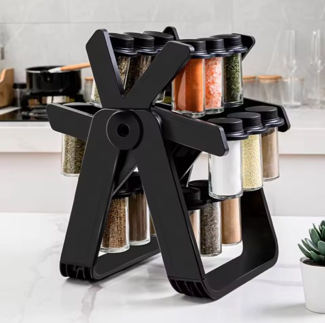 Keep your spices neat and accessible with our chic glass bottle set. This rotating spice rack makes cooking a breeze!