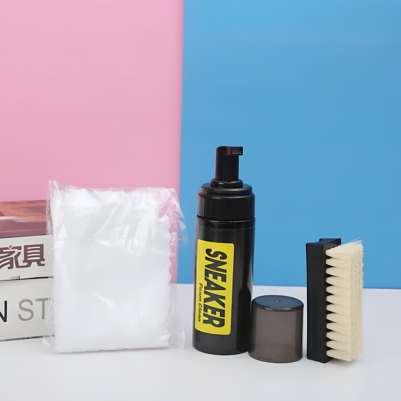 🟡 Material: Liquid foam cleaner, plastic bottle, soft bristle brush, microfiber towel.