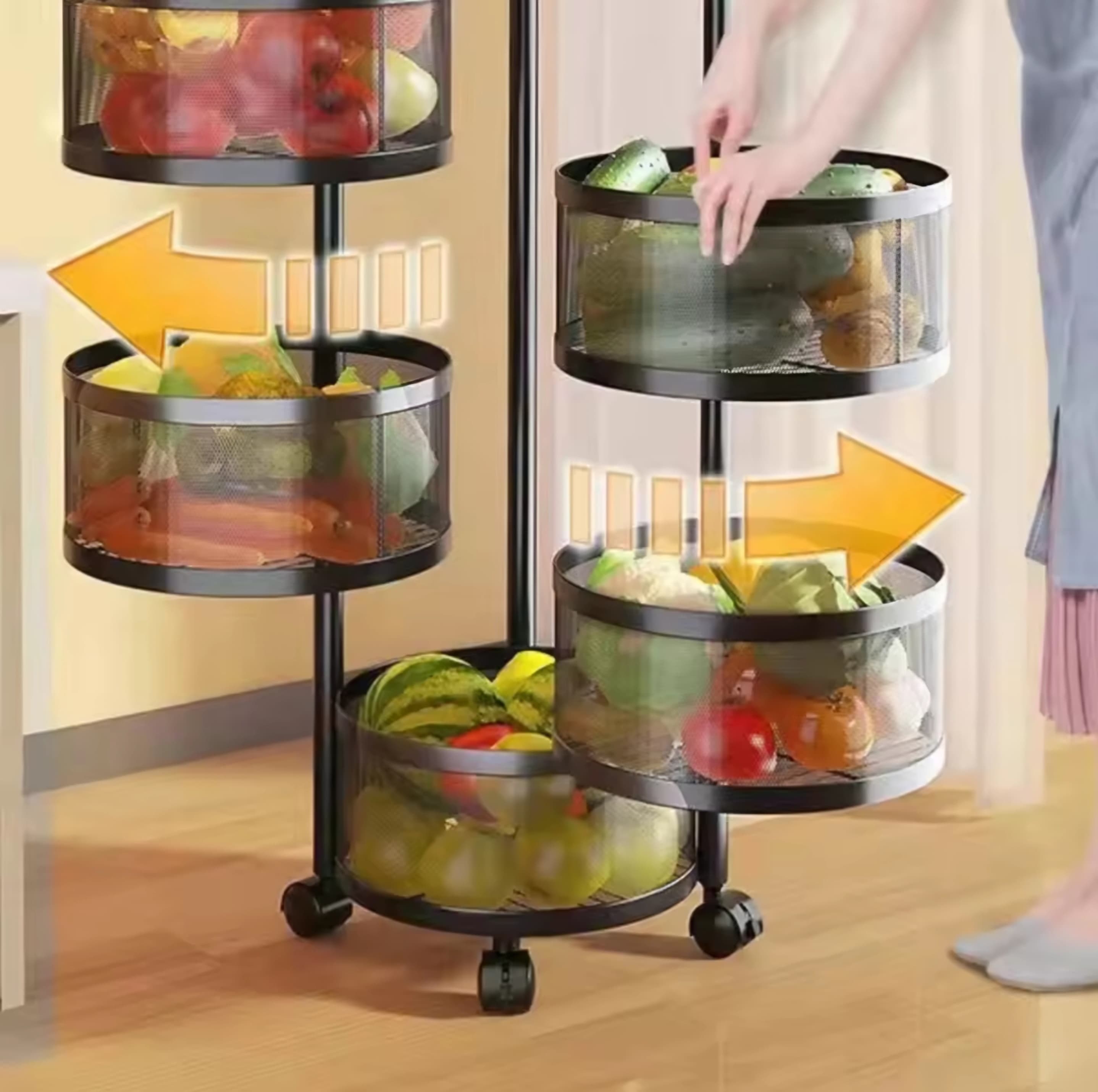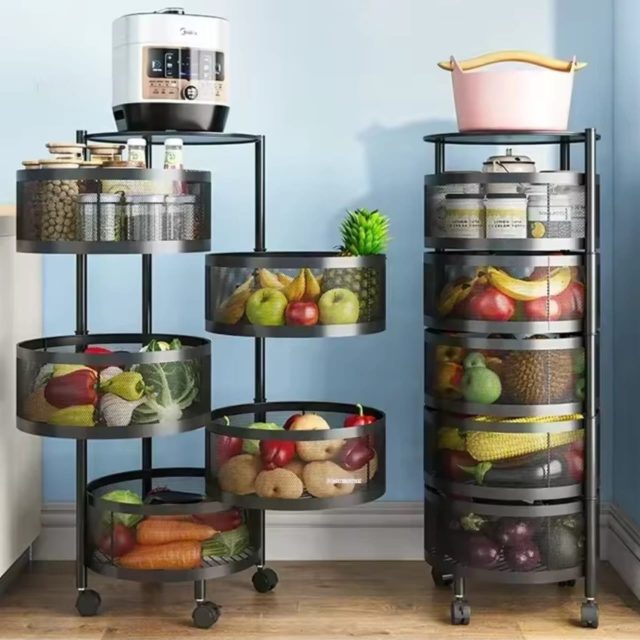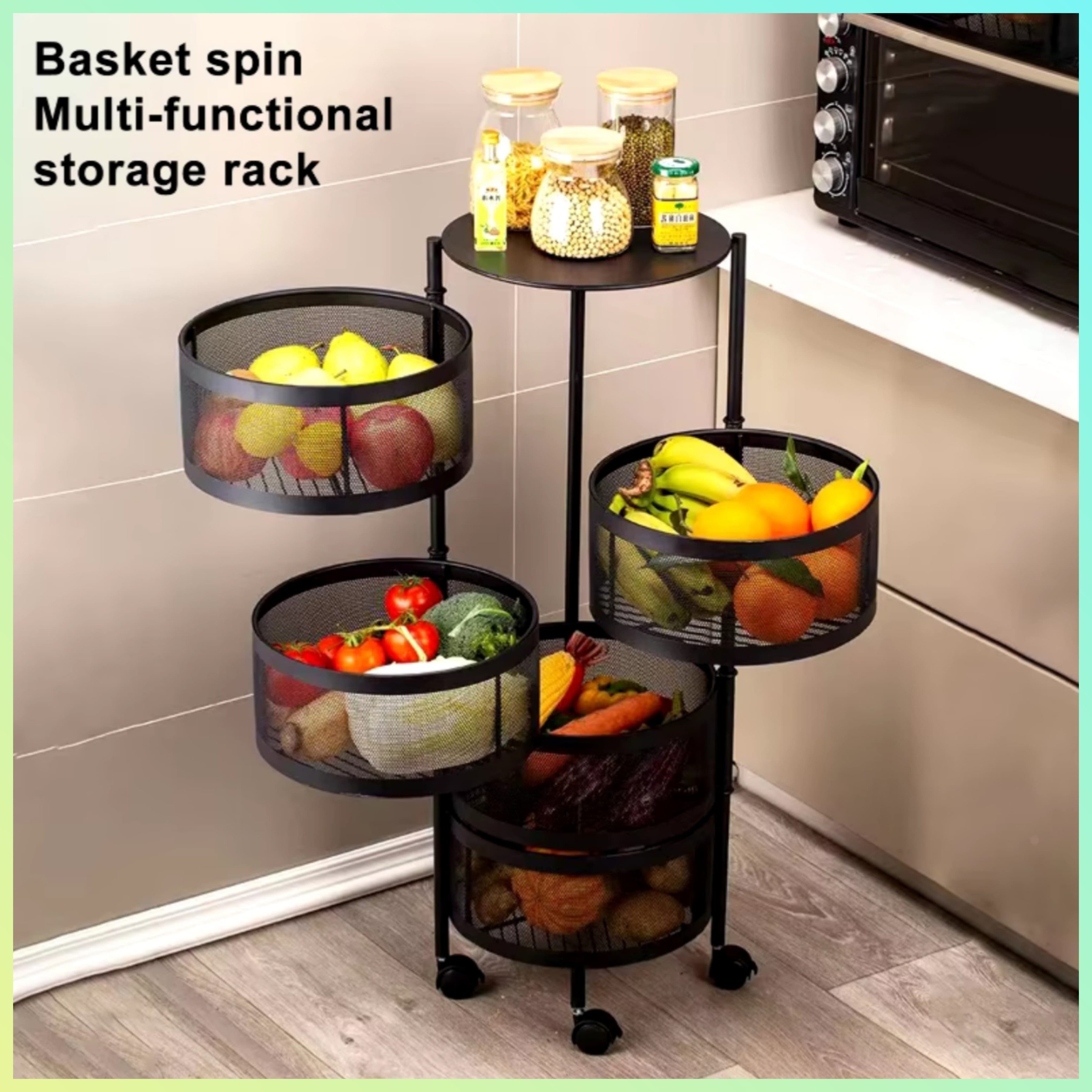 ✅ Rotating storage basket with 5 layers for easy access and organization. ✅ Ideal for storing fruits, vegetables, and other essentials.