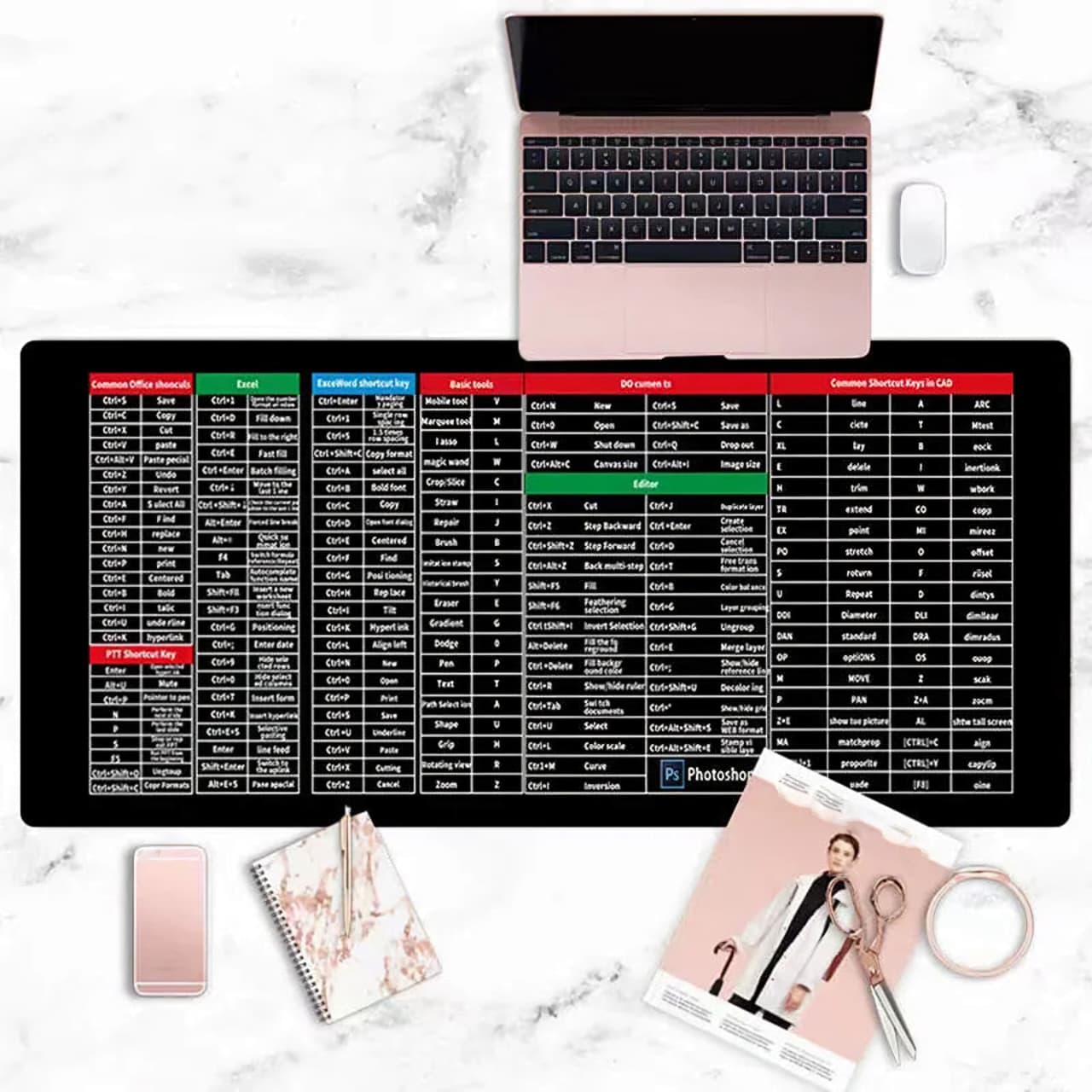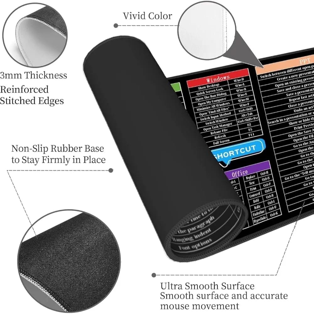 ✅️ Extra large desk mat with printed shortcut keys for daily productivity. ✅️ Smooth surface and non-slip base for comfortable work and gaming.